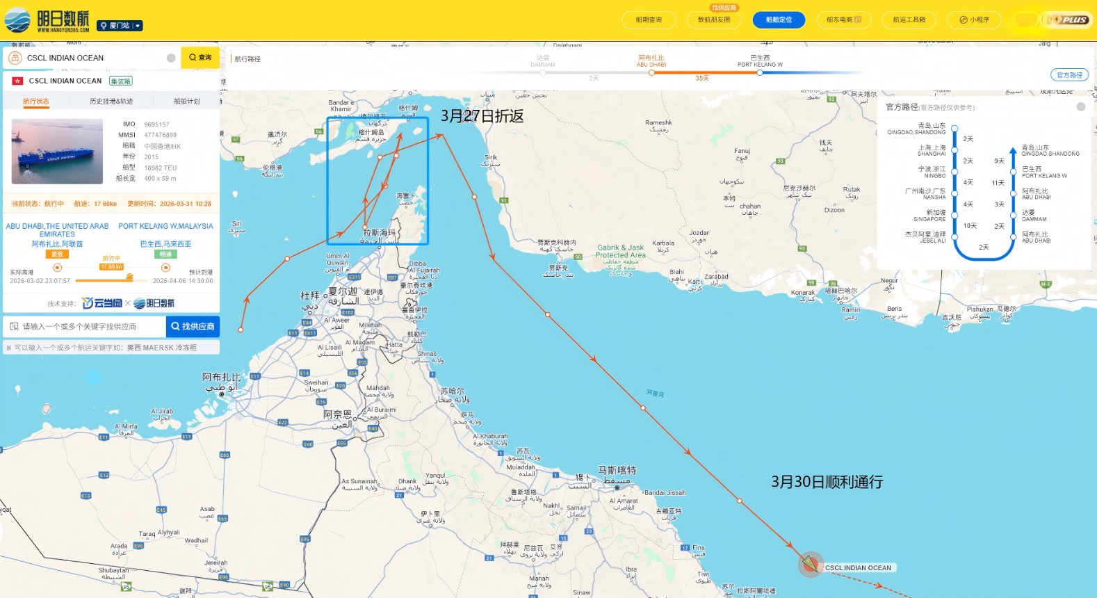 截至 2026 年 3 月 31 日 9 时 30 分最新消息,3 月 30 日北京时间 16 时 42 分,中远海运旗下 “中海北冰洋”“中海印度洋” 两艘集装箱船顺利完成霍尔木兹海峡全程通行,安全驶入阿曼湾海域。两船提前向伊朗海事部门报备,按指定安全航道编队航行,经伊朗相关部门核验护航后全程无阻拦。据航运监测平台数据显示,目前两艘船舶航行状态平稳,正驶向东南亚港口。中远海运官方确认,本次通行船舶为空载调运船只,当前波斯湾载货商业直航暂未恢复,仍沿用陆桥转运方案。在中东局势紧张背景下,中方友好籍船舶合规通行,成为近期海峡航运重要积极动态。