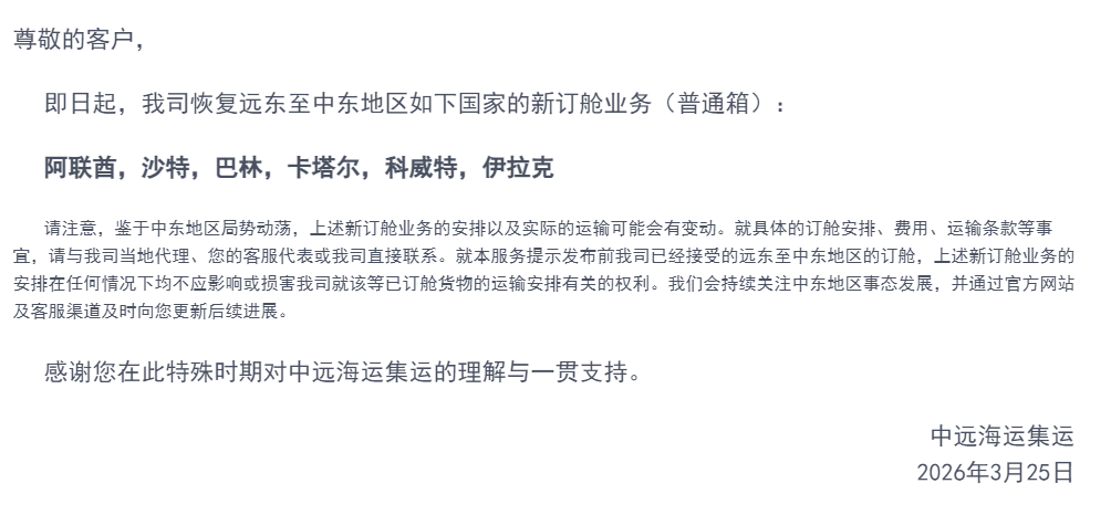 🎯中远海运集运宣布:恢复中东多国新订舱