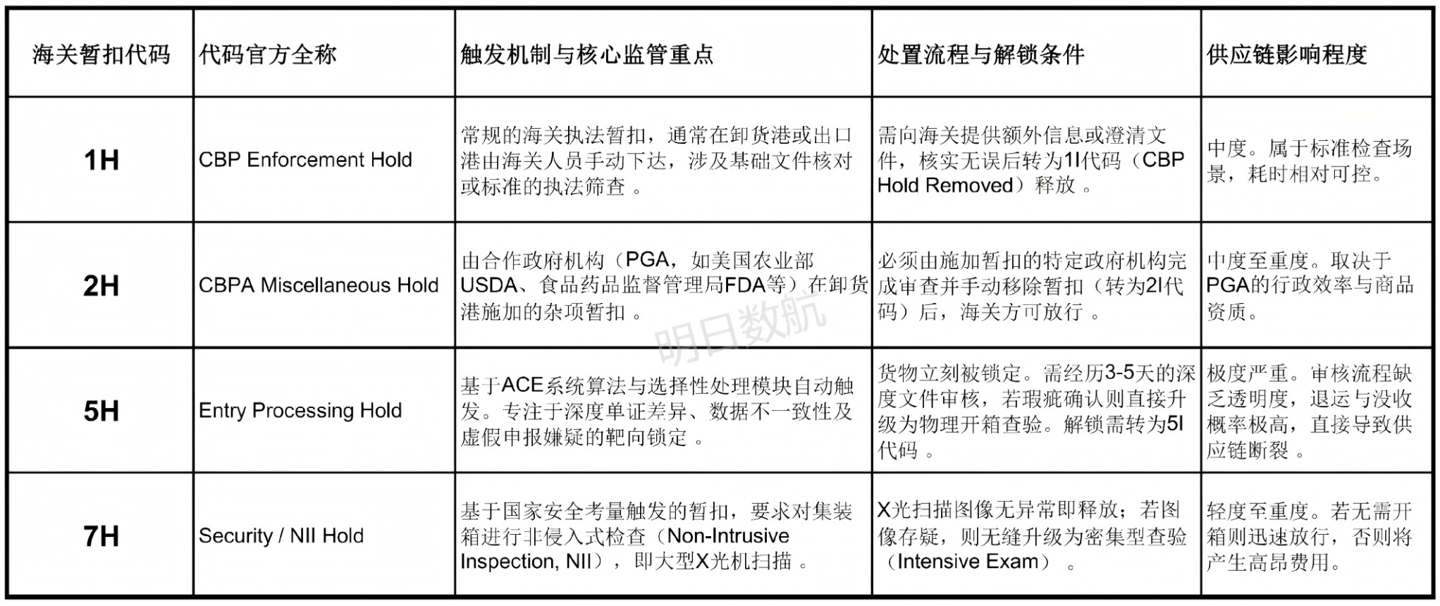 在美国清关的货代和外贸人,最近是不是被一堆 “H 开头” 的海关暂扣代码搞懵了?柜子一查显示 1H、2H、5H、7H,到底意味着什么?要多久才能放行?会不会直接被扣?这张表一次性给你讲透,别再踩坑!(重点看图⬇️)