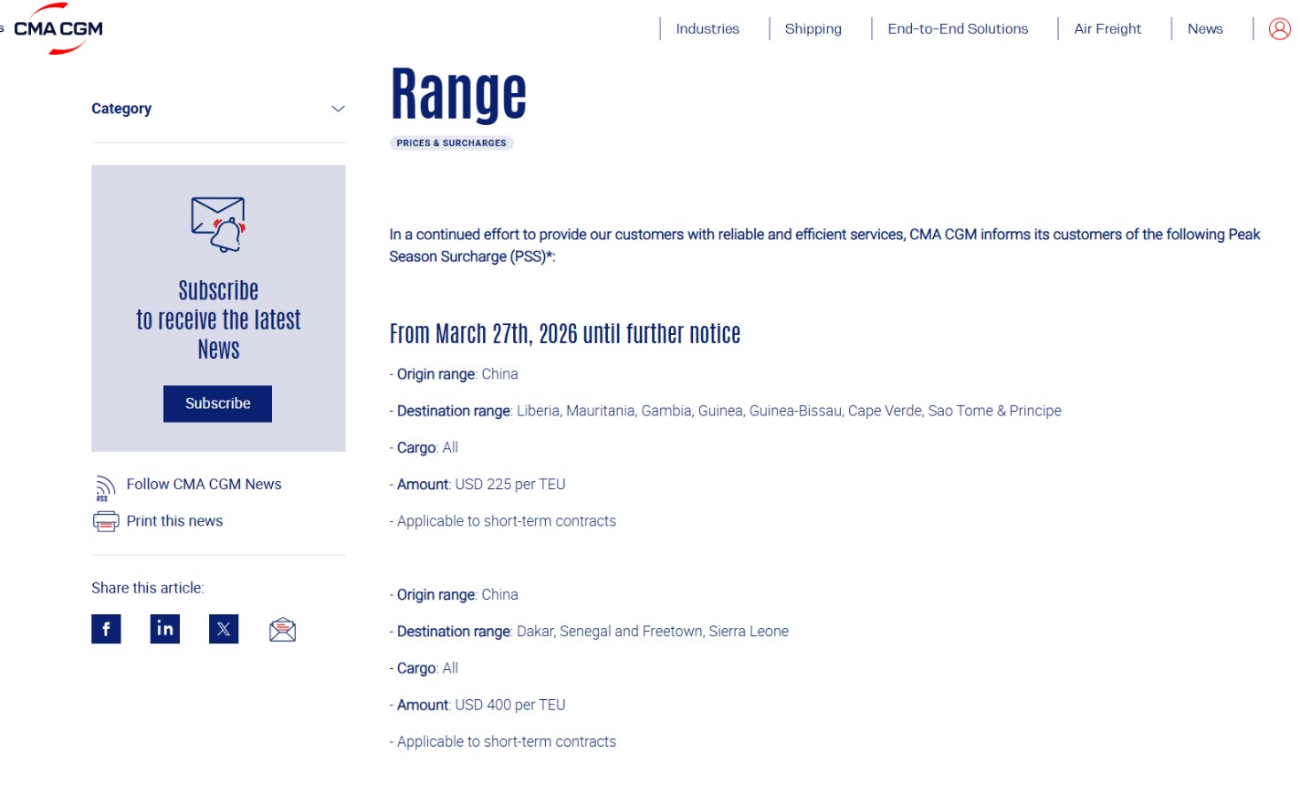 ▪️ 达飞:4月4日生效($200-300/TEU)