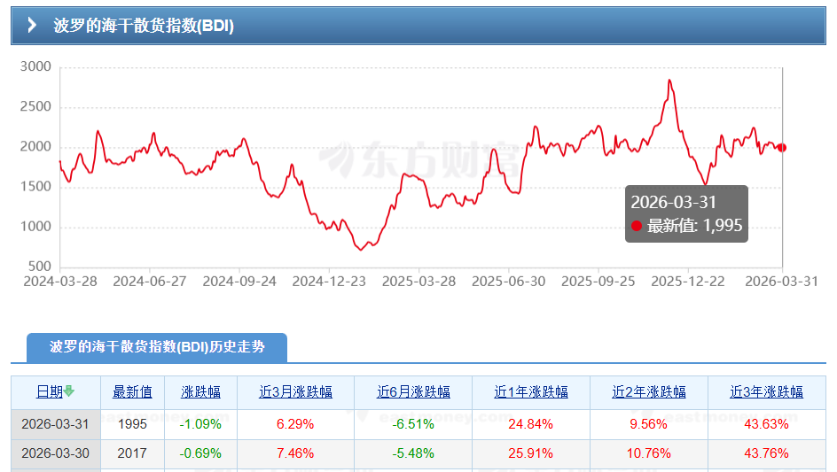 内容:波罗的海干散货指数 4 月 1 日收盘 1973 点,日跌 1.1%,连跌 3 日。海岬型(BCI)跌 1.9%、巴拿马型(BPI)微跌,铁矿石 / 煤炭补库放缓、澳洲发货受阻,市场观望情绪浓厚。#波罗的海干散货指数