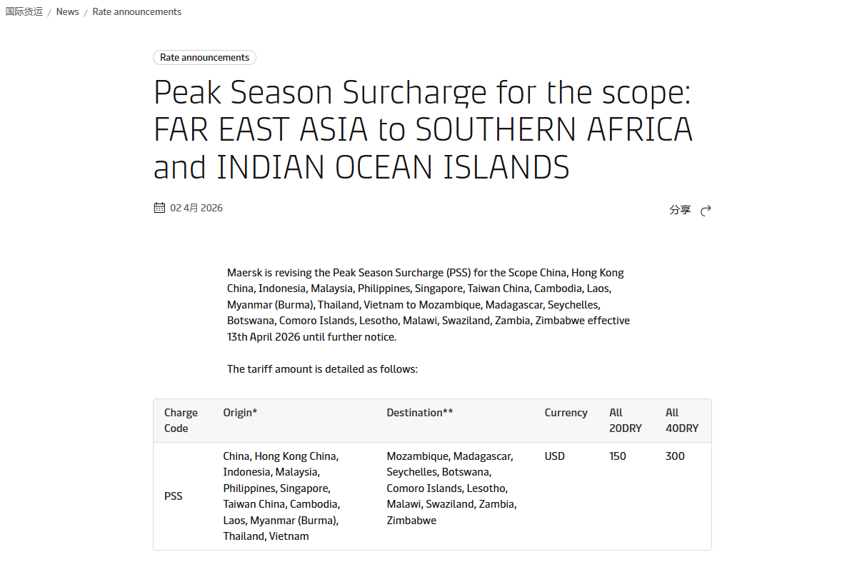 适...更多评论📢 马士基远东至南部非洲 / 印度洋岛国旺季附加费(PSS)公告