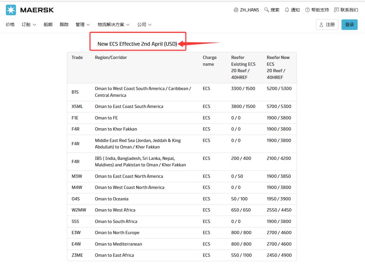 MAERSK官网 4 月 2 日发布最新公告,对阿曼、豪尔费坎航线冷藏货物的紧急成本附加费(ECS)进行更新。