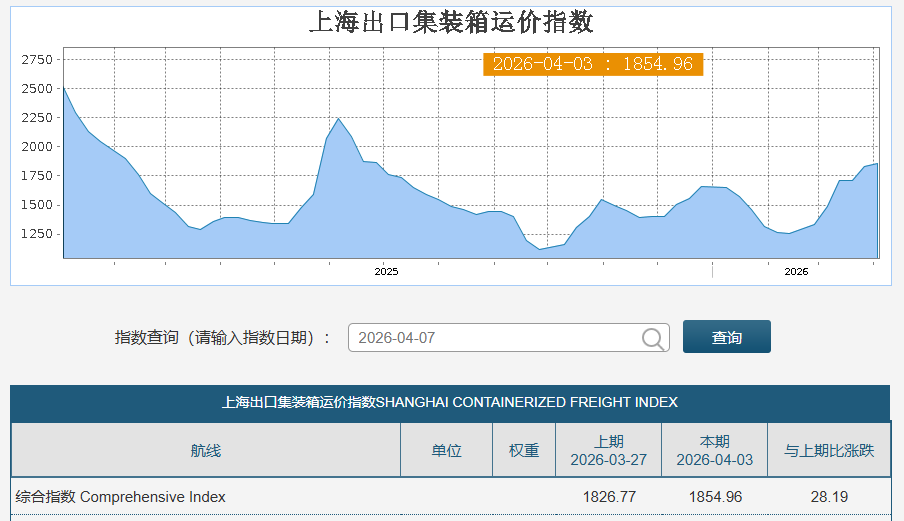 最新一期SCFI指数上涨28.19点至1854.96点,周涨幅1.54%。走势分化明显:美西微涨0.3%,美东涨幅2.76%;欧洲及地中海航线分别下跌3.11%和2.89%。波斯湾航线受地缘冲突影响,运价较冲突前已累计暴涨近200%,目前市场处于“有价无市”状态。评论⬆️SCFI 中东线领涨(4 月 6 日 19:00)