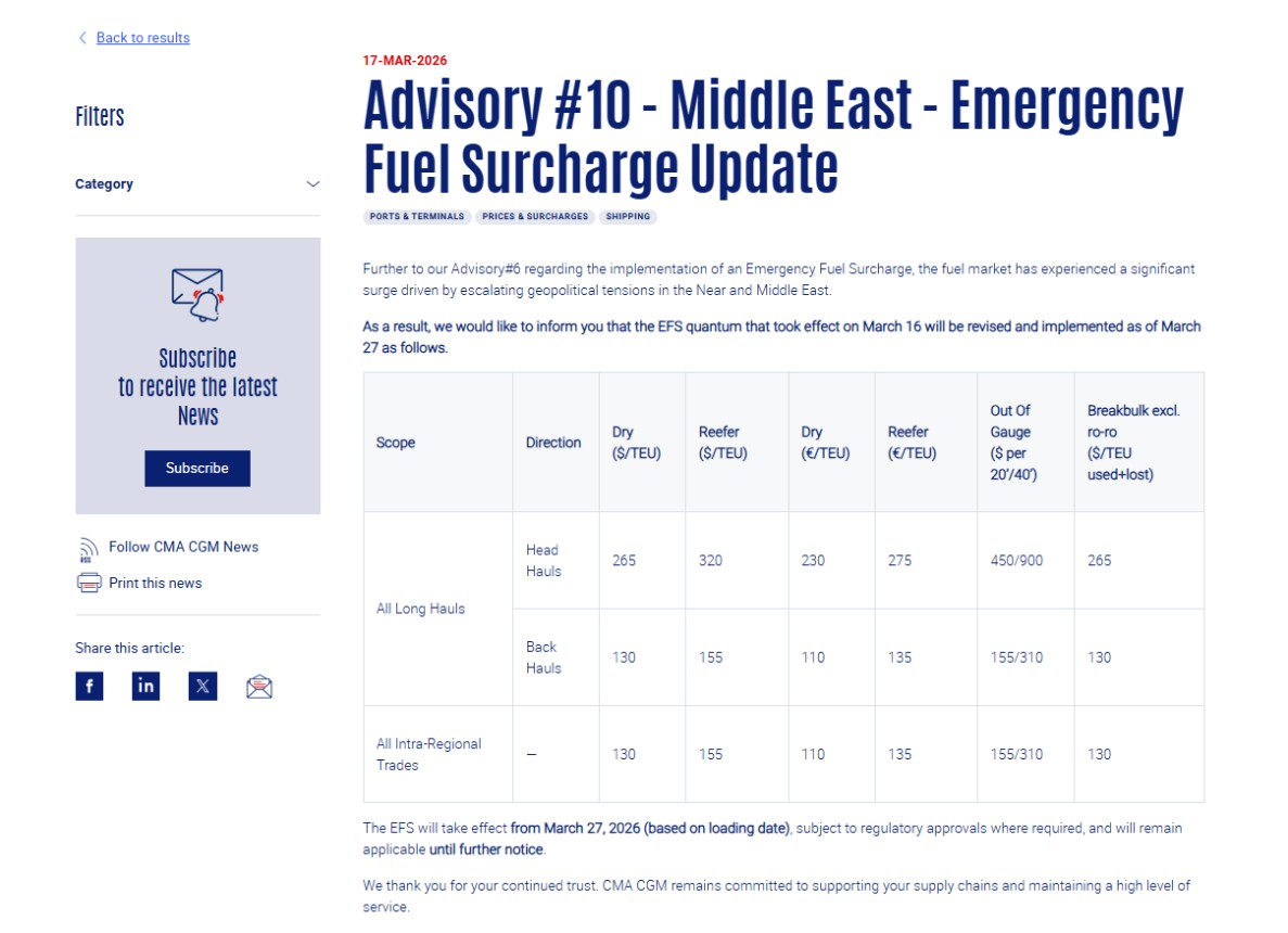 📊 达飞发布中东紧急燃油附加费第 10 号公告