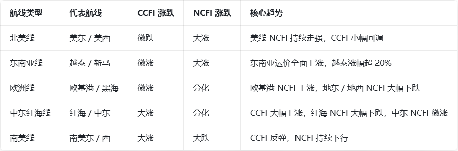 最新 CCFI/NCFI 数据出炉:美东 NCFI 暴涨 13.73%、美西涨 8.12%,美线运价持续冲高,出货抓紧锁价!东南亚越泰 NCFI 狂涨 22.21%,新马同步上行,舱位紧张。红海 NCFI 大跌 18.27%,中东微涨,波红 CCFI 逆...更多