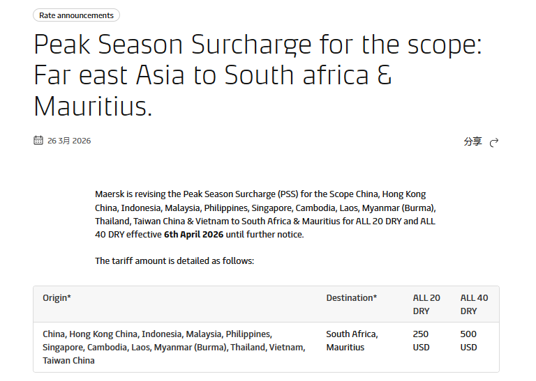 3 月 26 日发布公告,调整远东亚洲至南非、毛里求斯航线的旺季附加费(PSS),自2026 年 4 月 6 日起生效,直至另行通知。
