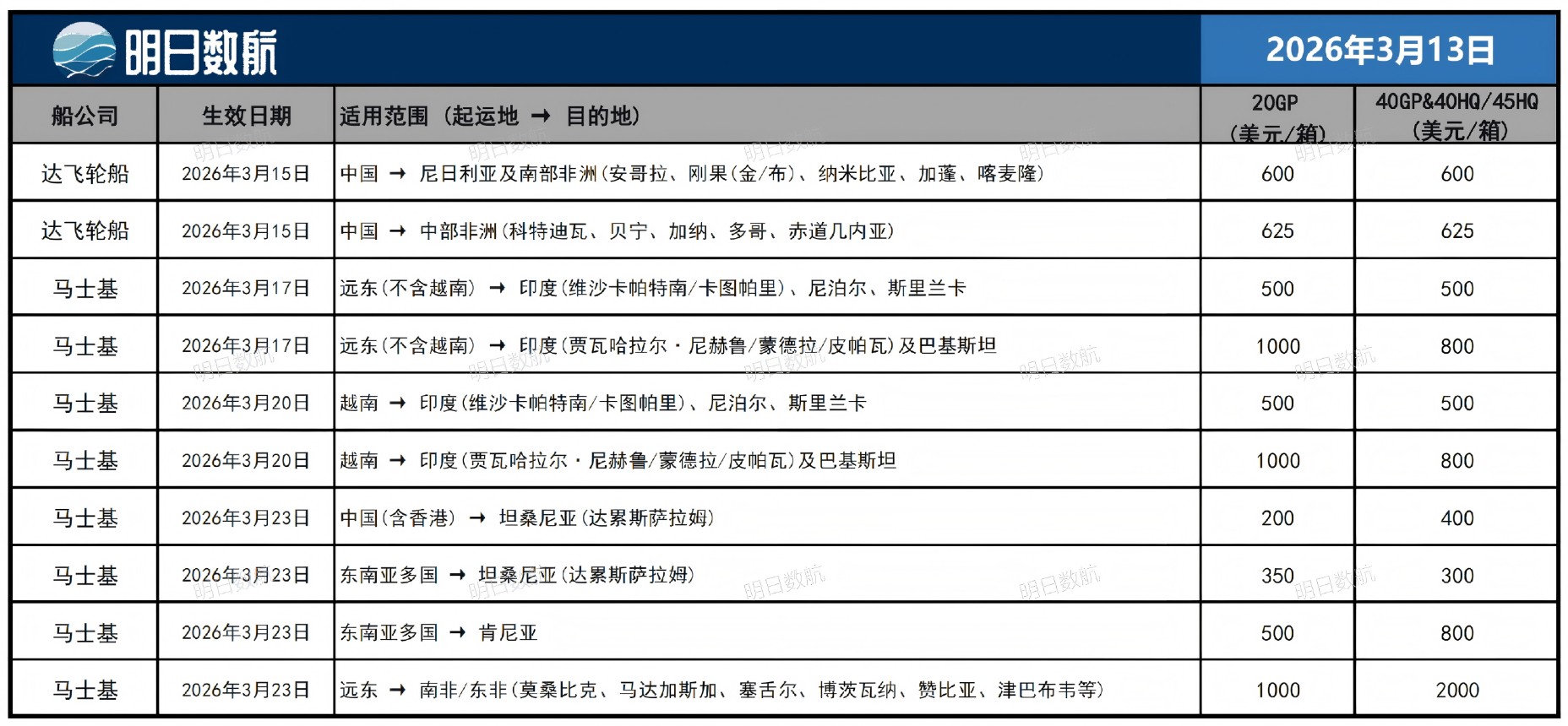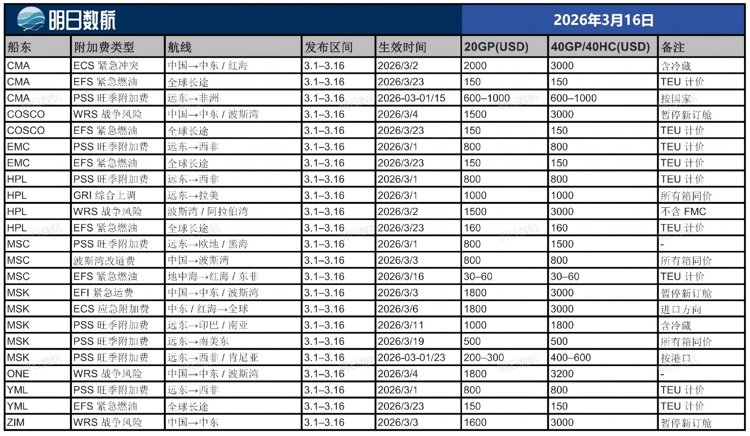 截至 2026 年 3 月 16 日,马士基、赫伯罗特、MSC、达飞、中远海运等主流船公司密集发布公告,3—4 月集中上调旺季附加费 PSS、紧急燃油附加费 EFS、战争风险附加费 WRS/ECS。