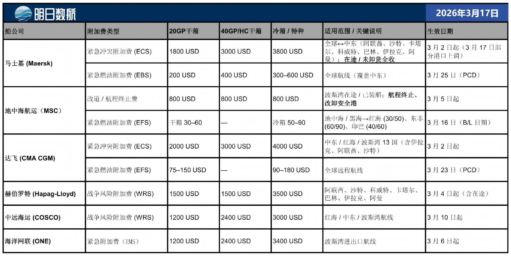 🔵中东 / 波斯湾航线普遍征收 WRS/ECS,干柜约 ...更多【3.16更新】2026 年 3-4 月全球船司附加费动态