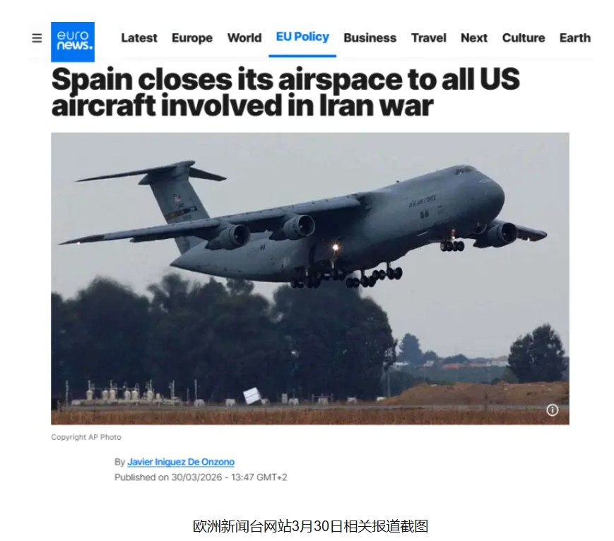 地球村广播站2026年3月31日 🌏国际要闻 西班牙关闭对美以对伊军机领空 精确时间:北京时间 3 月 30 日 19:00新闻摘要:西班牙官方宣布,禁止参与美以对伊军事行动的军机使用西班牙领空及罗塔、莫龙军事基地;不影响商业民航航班;为欧盟首个明确限制美以军事过境的成员国。#西班牙 转发 评论 点赞